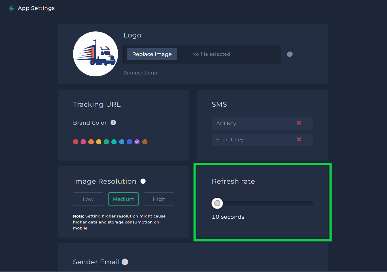 App Settings This module is a guide for App Settings where Fleet PH Users can customize their web profile. They can customize the following: a. Profile Logo b. The Color Theme of the Tracking URL c. Image Resolution for PODs to save data usage d. ...